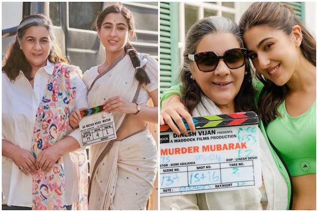 एक तस्वीर में सारा अपनी मां के साथ मर्डर मुबारक के सेट पर खड़ी हैं, वहीं दूसरी तस्वीर में बेटी-मां की जोड़ी ऐवतन मेरे वतन के सेट पर नजर आ रही है.