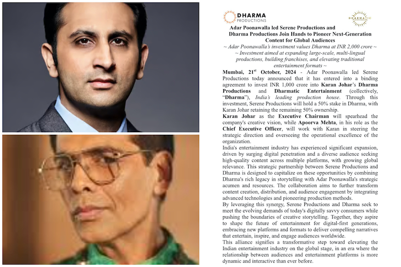 वैक्सीन निर्माता कंपनी सीरम इंस्टीट्यूट ऑफ इंडिया के सीईओ अदार पूनावाला अब फिल्म निर्माता करण जौहर की धर्मा प्रोडक्शंसकंपनी के हिस्सेदार हो गए हैं। उन्होंने धर्मा प्रोडक्शंस के 50 फीसदी हिस्सेदारी खरीद ली है। पूनावला ने 1000 करोड़ रुपये में यह डीलकी है। इस करार के तहत फिल्म एंड टेलिविजन प्रोडक्शन एंड डिस्ट्रीब्यूशन कंपनी धर्मा प्रॉडक्शंस का वैल्यूएशन करीब 2000 करोड़रुपये किया गया है। अदार यह निवेश अपनी पर्सनल कैपेसिटी में कर रहे हैं। वे धर्मा प्रोडक्शंस के 50 प्रतिशत के हिस्सेदार बन गए हैं।