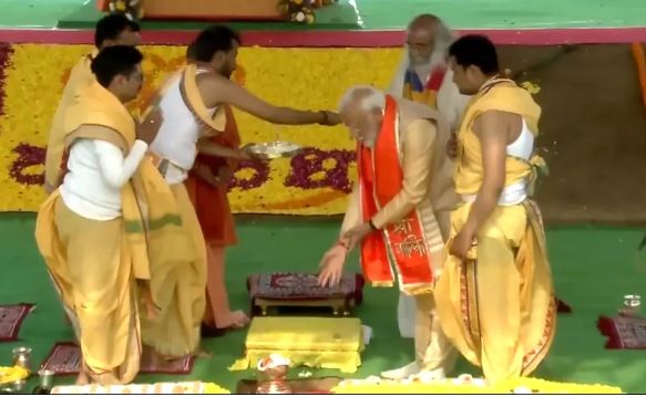 #WATCH | Uttar Pradesh: Prime Minister Narendra Modi lays the foundation stone of Hindu shrine Kalki Dham in Sambhal.