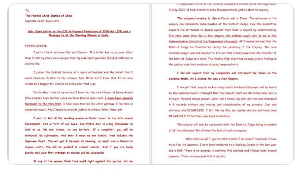 बांदा के बबेरू तालुक में सिविल जज के पद पर तैनात अर्पिता साहू ने एक पत्र लिखकर अपनी आपबीती बताई कि कैसे जज और उनके सहयोगी ने उन्हें रात में घर आने के लिए मजबूर किया। उसे शारीरिक और मानसिक रूप से प्रताड़ित किया गया. जब उसने न्याय मांगा तो कोई सुनवाई नहीं हुई। डेढ़ साल बाद भी मेरे साथ हुए अन्याय से किसी को कोई फर्क नहीं पड़ता और मैंने अपनी जिंदगी खत्म करने का फैसला किया है।' मैं अब जीना नहीं चाहता. इसलिए मैं सुप्रीम कोर्ट से इच्छामृत्यु की इजाजत मांगता हूं.'