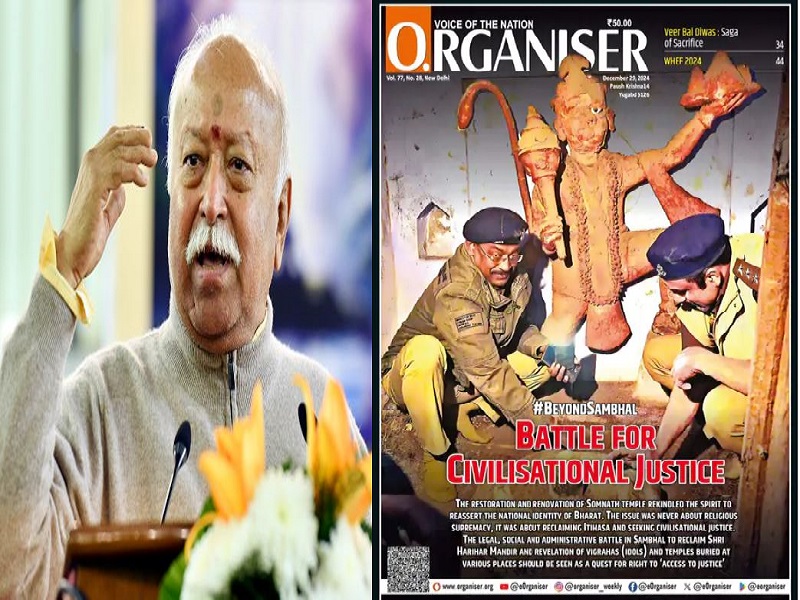 मुंबई, 26 दिसंबर, (न्यूज़ हेल्पलाइन)। राष्ट्रीय स्वयंसेवक संघ (RSS) के अंग्रेजी मुखपत्र ऑर्गनाइजर ने हालिया मंदिर-मस्जिद विवादों पर RSS प्रमुख मोहन भागवत से अलग राय रखी है। पत्रिका ने अपने ताजा अंक में इसे ऐतिहासिक सच जानने और सभ्यतागत न्याय की लड़ाई कहा है। मोहन भागवत ने 19 दिसंबर को पुणे में कहा था कि राम मंदिर के निर्माण के बाद कुछ लोगों को लगता है कि वे नई जगहों पर इस तरह के मुद्दे उठाकर हिंदुओं के नेता बन सकते हैं। हर दिन एक नया मामला उठाया जा रहा है। इसकी इजाजत कैसे दी जा सकती है? भारत को दिखाने की जरूरत है कि हम एक साथ रह सकते हैं। ऑर्गनाइजर के संपादक प्रफुल्ल केतकर ने संपादकीय में लिखा है कि सोमनाथ से लेकर संभल और उससे आगे का ऐतिहासिक सत्य जानने की यह लड़ाई धार्मिक वर्चस्व के बारे में नहीं है। यह हमारी राष्ट्रीय पहचान की पुष्टि करने और सभ्यतागत न्याय की लड़ाई है। उत्तर प्रदेश के ऐतिहासिक शहर की जामा मस्जिद में श्री हरिहर मंदिर के सर्वे से शुरू हुए विवाद ने संवैधानिक अधिकारों पर एक नई बहस को जन्म दिया है। हमें धर्मनिरपेक्षता की झूठी बहस के बजाय समाज के सभी वर्गों को शामिल करते हुए सभ्यतागत न्याय की खोज करने की जरूरत है। कांग्रेस के षड्यंत्र ने मुगल सम्राट बाबर और औरंगजेब जैसे कट्टर शासकों की बड़ी छवि पेश की। इससे भारतीय मुसलमानों में गलत धारणा बनी कि वे अंग्रेजों से पहले यहां के शासक थे। भारत के मुसलमानों को यह समझना चाहिए कि वे शासक नहीं बर्बर इस्लामी आक्रमणों के प्रतीक हैं। भारतीय मुसलमानों के पूर्वज हिंदुओं के विभिन्न संप्रदायों से हैं इसलिए उन्हें अपनी विचारधारा बदलनी चाहिए।