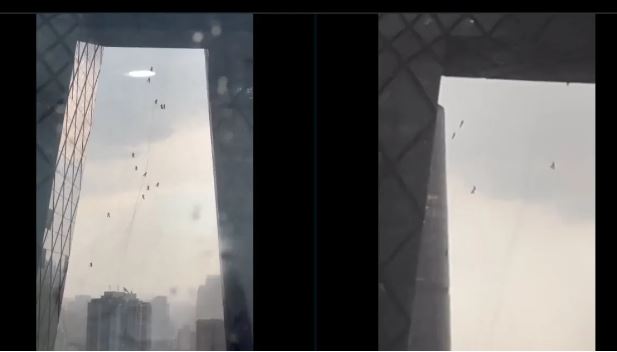 बीजिंग में अचानक आए तूफ़ान ने नियमित सफ़ाई को एक भयानक परीक्षा में बदल दिया। शहर के ऊपर, चालक दल के सदस्य अपने केबलों से चिपके हुए थे, जबकि सीसीटीवी मुख्यालय हवा के झोंकों में हिल रहा था।घटना के वीडियो ऑनलाइन जारी किए गए। क्लिप में दिखाया गया है कि तेज़ हवाएँ ज़मीन से सैकड़ों मीटर ऊपर रस्सी पर काम करने वाले मज़दूरों को पागल कर रही हैं। बीजिंग में बह रही हवा के प्रकोप के बावजूद मज़दूर स्थिर रहने की कोशिश करते हुए देखे गए।