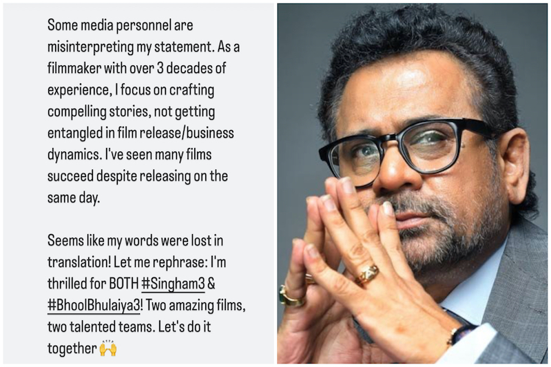 अनीस बज्मी ने अपने ऑफिशियल X अकाउंट (पहले ट्विटर) पर लिखा है, कुछ मीडिया के लोगों ने मेरे बयान को गलत तरह पेश किया है। 3 दशकोंके अनुभव के साथ फिल्ममेकर होने के चलते मैं क्राफ्ट और कहानियां बुनने पर फोकस करता हूं और फिल्म रिलीज और बिजनेस डाइनैमिक्स में नहींउलझता। मैंने कई फिल्मों को एक ही दिन रिलीज होकर अच्छा प्रदर्शन करते देखा है।