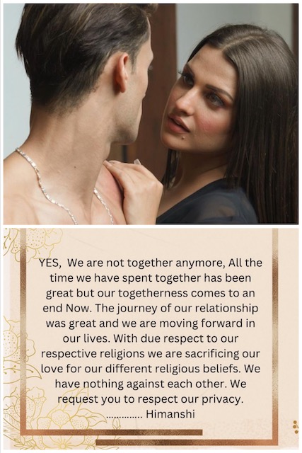 बीते दिन हिमांशी ने पोस्ट करते हुए लिखा 'हां हम अब साथ नहीं हैं, हमने जो भी वक्त साथ में बिताया वह अच्छा रहा है, लेकिन अब हमारा साथ खत्म हो गया। हमारे रिश्ते का जितना सफर था, वो बहुत अच्छा रहा। अब हम अपने-अपने जीवन में आगे बढ़ रहे हैं। अपने-अपने धर्मों का सम्मान करते हुए, कई धार्मिक मान्यताओं के मद्देनजर हम अपने प्यार का त्याग कर रहे हैं। हमारे मन में अब एक-दूसरे के लिए कुछ नहीं है। हमारी प्राइवेसी करें'।