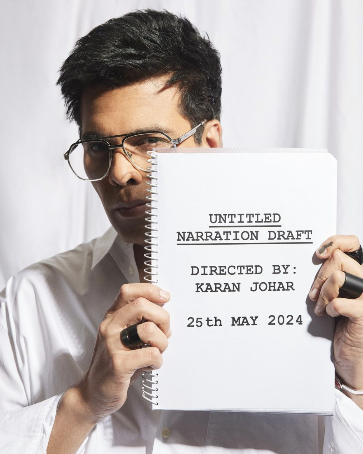 उन्होंने इंस्टाग्राम पर पोस्ट साझा करते हुए अपनी नई फिल्म का एलान किया। उन्होंने इंस्टाग्राम हैंडल पर एक तस्वीर शेयर कीहै, जिसमें वे सफेद शर्ट में बेहद हैंडसम लग रहे हैं। तस्वीर में उन्हें अपने अगले निर्देशन परियोजना का बोर्ड पकड़े हुए देखा जासकता है। उनके हाथ में जो फाइल है, उसके पहले पन्ने पर लिखा है, 'शीर्षकहीन नैरेशन ड्राफ्ट, करण जौहर द्वारा निर्देशित, 25 मई 2024।' इस तस्वीर को शेयर करते हुए उन्होंने लाल दिल वाले इमोजी के साथ लिखा, 'गेट… सेट...गो।'