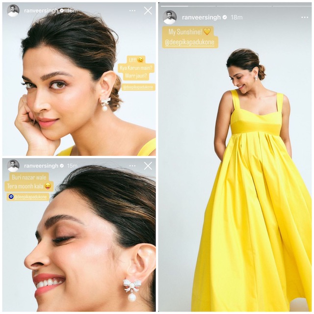 दीपिका पादुकोण द्वारा येलो ड्रेस में कई तस्वीरें शेयर करने के बाद, उनके पति रणवीर सिंह उनकी तारीफ करने से खुद को रोकनहीं पाए। रणवीर ने एक तस्वीर पोस्ट करते हुए लिखा, "उफ्फ! क्या करूं मैं? मर जाऊं?" एक दूसरे तस्वीर पर उन्होंने लिखा, "बुरी नज़र वाले तेरा मूंह काला,"। आखिरी तस्वीर में उन्होंने प्यार से दीपिका को अपनी सनशाइन कहा।
