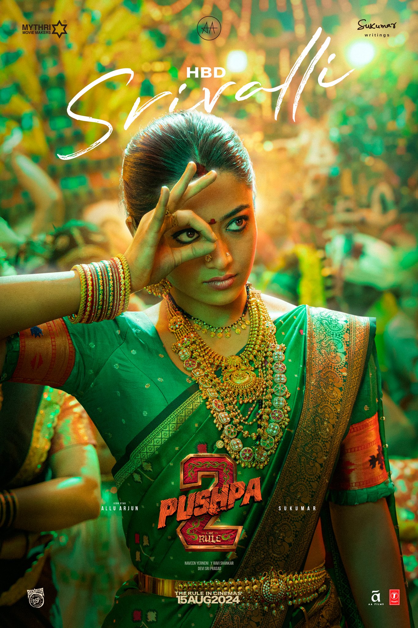 इस पोस्टर में रश्मिका को ग्रीन कांजीवरम साड़ी पहने देखा जा रहा है. उनकी मांग में सिंदूर और माथे पर लाल बिंदिया सजाएहुए देखा जा रहा है. एक्ट्रेस के श्रीवल्ली लुक को हैवी गोल्ड की ज्वेलरी से कंप्लीट किया गया है और बालों का बन बनाकरबांधा हुआ है. वहीं, पोस्टर में एक्ट्रेस हाथ के इशारे स अलग अंदाज में पोज देती हुई दिख रही हैं।