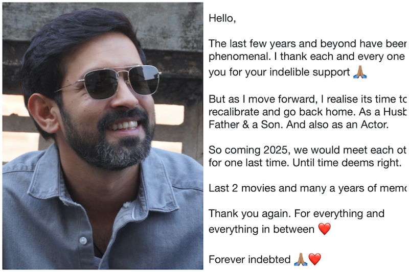 विक्रांत ने सोशल मीडिया पर लिखा, "नमस्ते, पिछले कुछ वर्ष अभूतपूर्व रहे हैं। मैं आपके अमिट समर्थन के लिए आप सभी को धन्यवाद देता हूं।लेकिन जैसे-जैसे मैं आगे बढ़ रहा हूं, मुझे एहसास होता है कि एक पति, पिता और एक बेटे के रूप में, पुनर्गठित होने और घर वापस जाने का समयआ गया है और एक अभिनेता के रूप में भी. इसलिए आने वाले 2025 में हम आखिरी बार एक-दूसरे से मिलेंगे। जब तक समय सही न लगे. पिछली 2 फिल्में और कई सालों की यादें। फिर सेधन्यवाद। हर चीज़ के लिए और बीच में मौजूद हर चीज़ के लिए। सदैव ऋणी."