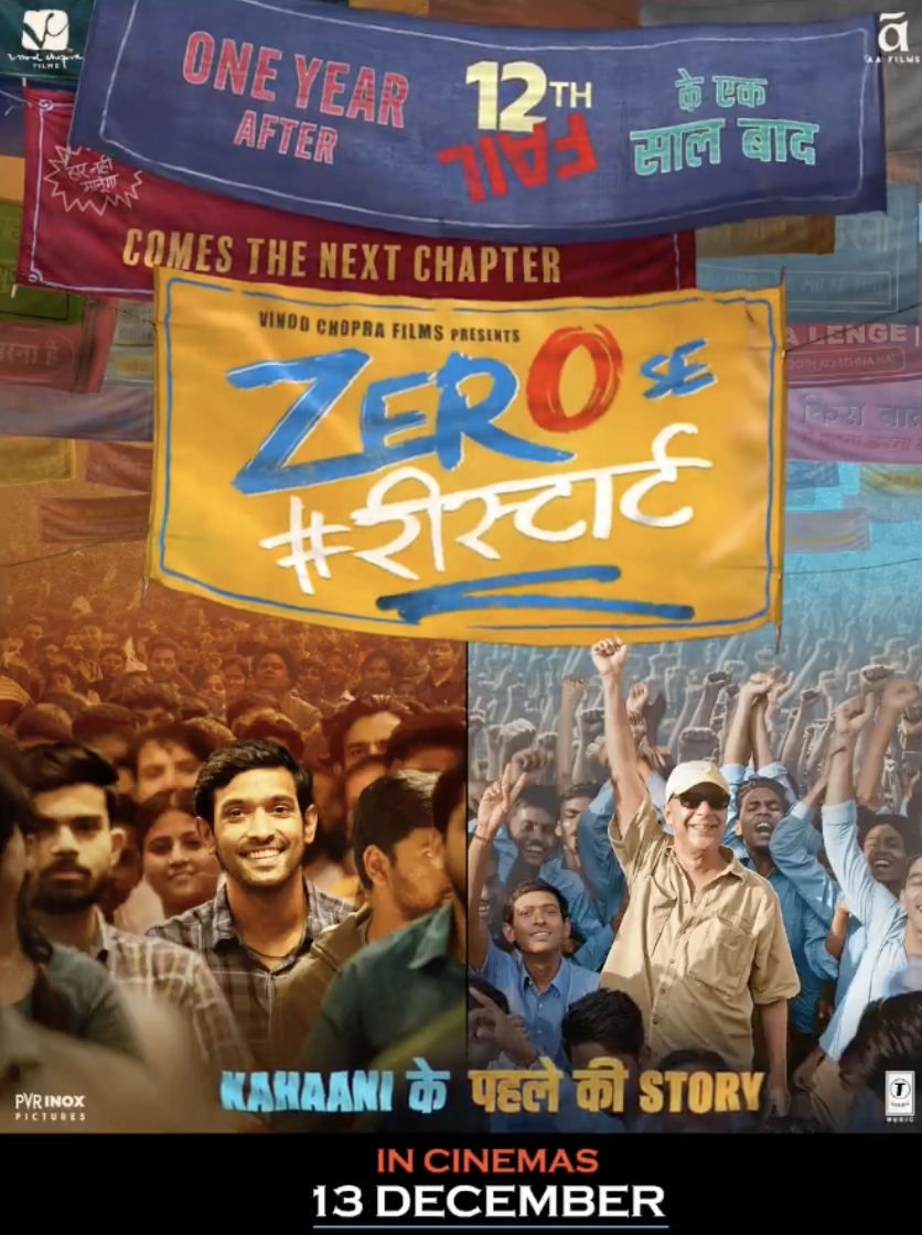 विधु विनोद चोपड़ा ने अपने सोशल मीडिया पर शेयर किया, "आपने 12वीं फेल देखी और पसंद की, अब इसकी कहानी जानें कि कैसेयह लगभग कभी नहीं बन पाई और उस प्रतिभाशाली फिल्म निर्माता की जिसने कभी हार नहीं मानी! विधु विनोद चोपड़ा प्रस्तुत करते हैं, जीरो से रीस्टार्ट, #ZeroSeRestart सिनेमाघरों में, 13 दिसंबर!"