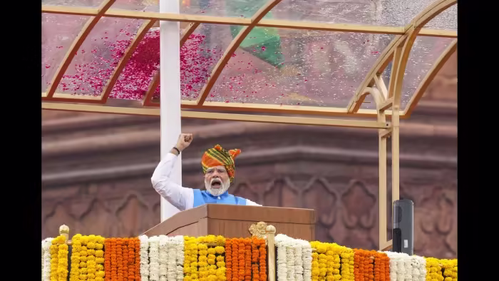 दिल्ली न्यूज डेस्क !!! 78वें स्वतंत्रता दिवस के मौके पर पीएम मोदी ने लाल किले पर झंडा फहराया. इसके बाद उन्होंने देशवासियों को संबोधित भी किया. देश की आजादी के जश्न के मौके पर पीएम मोदी ने खास पोशाक पहनी थी. लाल किले पर आयोजित समारोह में पीएम सफेद कुर्ता और चूड़ीदार पायजामा के साथ लहरिया प्रिंट का बहुरंगी साफा पहने नजर आए। बता दें कि उन्होंने लगातार 11वीं बार राष्ट्रीय ध्वज फहराया और लाल किले की प्राचीर से राष्ट्र को संबोधित किया।