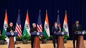 एंटनी ब्लिंकन और लॉयड ऑस्टिन 5वीं भारत-अमेरिका 2+2 मंत्रिस्तरीय वार्ता के लिए एस जयशंकर और राजनाथ सिंह के साथ शामिल होंगे।अमेरिकी विदेश मंत्री एंटनी ब्लिंकन ने शुक्रवार को वार्षिक "टू-प्लस-टू" वार्ता से पहले विदेश मंत्री एस जयशंकर से मुलाकात की। जयशंकर ने जून में प्रधान मंत्री नरेंद्र मोदी और सितंबर में अमेरिकी राष्ट्रपति जो बिडेन की यात्राओं का अनुसरण करने की आवश्यकता पर बल देते हुए ब्लिंकन की यात्रा के महत्व पर प्रकाश डाला।