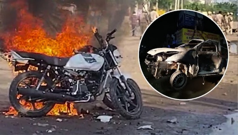 नूंह में भगवा यात्रा पर पथराव के बाद भड़की हिंसा, कई गाड़ियों को फूंका; देखें उपद्रव की तस्वीरें