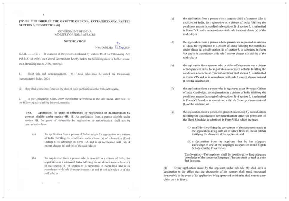 मुंबई, 11 मार्च, (न्यूज़ हेल्पलाइन)। केंद्र सरकार ने सिटीजनशिप अमेंडमेंट एक्ट यानी CAA का नोटिफिकेशन जारी कर दिया है। इसके साथ ही यह कानून देशभर में लागू हो गया है। CAA को हिंदी में नागरिकता संशोधन कानून कहा जाता है। इससे पाकिस्तान, बांग्लादेश अफगानिस्तान से आए गैर मुस्लिम शरणार्थियों को नागरिकता मिलने का रास्ता साफ हो गया है।