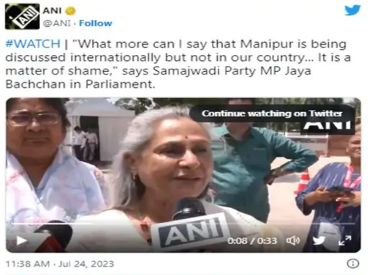 सरकार को अपने राज्यो के बारे में भी बात करनी चाहिए। UP, MP में क्या हो रहा है, उन्हें ये भी बताना चाहिए। बाकी उनको जो कुछ भी बचा है, आगे तो वो भी नहीं बचेगा। वहीं, इससे पहले पिछले हफ्ते जया बच्चन ने कहा था कि मणिपुर में आदिवासी महिलाओं को नग्न घुमाए जाने पर उन्हे शर्मिंदगी महसूस हो रही है। वे ये वीडियो पूरा नहीं देख पाईं। उन्होंने कहा कि घटना मई महीने की है और वीडियो अभी वायरल हो रहा है। किसी ने भी सहानुभूति में एक शब्द भी नहीं कहा। देश में महिलाओं के साथ रोज कुछ न कुछ घटित हो रहा है, यह बहुत ही निराशाजनक है। महिलाओं की सुरक्षा में सरकार विफल साबित हुई।