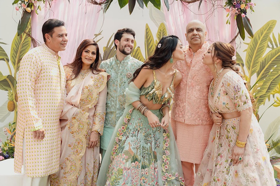 मसाबा की शादी बेहद सादगी से हुई। उन्होंने अपने फैशन लेबल से एक जीवंत लहंगा चुना, जिसमें सोने के धागों के साथ पान-पत्ती की कढ़ाई थी। लहंगे को दो दुपट्टों के साथ जोड़ा गया था - एक वॉलफ्लॉवर डिज़ाइन के साथ नींबू हरे रंग में, और दूसरा रानी गुलाबी रंग में कढ़ाई और एक अनुक्रमित बॉर्डर के साथ। मसाबा ने खुद को एक बहु-स्तरीय हार, आकर्षक झुमके और एक हेडगियर से सजाया, जो उनके सादे लेकिन स्टाइलिश दुल्हन के लुक को पूरा कर रहा था। उनकी पसंद की सादगी, व्यक्तिगत विवरण के साथ मिलकर, उनकी शादी की पोशाक को उनकी अनूठी शैली की एक सुस्वादु और यादगार अभिव्यक्ति बना दिया।