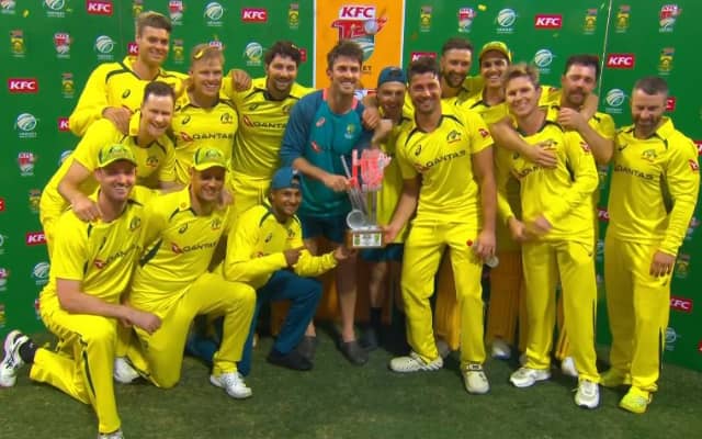 AUS vs SA 3rd T20 मैच रिपोर्ट: ऑस्ट्रेलिया ने तीसरे टी20 मैच में साउथ अफ्रीका को 5 विकेट से हरा दिया. इस तरह ऑस्ट्रेलियाई टीम ने 3 टी20 मैचों की सीरीज 3-0 से जीत ली है. ऑस्ट्रेलिया को जीत के लिए 191 रनों का लक्ष्य मिला था. ऑस्ट्रेलिया ने 17.5 ओवर में 5 विकेट पर 191 रन बनाकर दक्षिण अफ्रीका का सफाया कर दिया। ऑस्ट्रेलिया के लिए ट्रेविस हेड ने 48 गेंदों पर सबसे ज्यादा 91 रन की पारी खेली. उन्होंने अपनी पारी में 8 चौके और 6 छक्के लगाए. ऑस्ट्रेलिया ने दक्षिण अफ्रीका का सफाया कर दिया इसके अलावा जोश इंग्लिश ने 22 गेंदों में 42 रनों का योगदान दिया. उन्होंने अपनी पारी में 1 चौका और 4 छक्के लगाए. मिचेल मार्श ने 12 गेंदों पर 15 रन बनाए. मार्कस स्टोइनिस 21 गेंदों पर 37 रन बनाकर नाबाद लौटे। इस ऑलराउंडर ने अपनी पारी में 2 चौके और 3 छक्के लगाए. हालांकि, ऑस्ट्रेलियाई ओपनर मैथ्यू शॉर्ट और टिम डेविड सस्ते में पवेलियन लौट गए। दक्षिण अफ्रीका के लिए ज़र्न फॉर्च्यून और गेराल्ड कौत्जी ने 2-2 विकेट लिए। एडन मार्करम ने 1 विकेट लिया. ऑस्ट्रेलिया-साउथ अफ्रीका तीसरे टी20 मैच में क्या हुआ... इससे पहले दक्षिण अफ्रीका ने टॉस जीतकर बल्लेबाजी का फैसला किया. दक्षिण अफ्रीका के लिए डोनोवन फेरेरिया ने 21 गेंदों पर 48 रन बनाए. रेजा हेनरिक्स ने 30 गेंदों पर 41 रनों का योगदान दिया. एडन मार्करम ने 23 गेंदों पर 41 रन बनाए. ऑस्ट्रेलिया की ओर से सीन एबॉट ने सबसे ज्यादा 4 विकेट लिए. मार्कस स्टोइनिस ने 2 खिलाड़ियों को आउट किया. तनवीर सांघा को 1 सफलता मिली. ऑस्ट्रेलियाई खिलाड़ी ट्रैविस हेड को उनकी शानदार पारी के लिए प्लेयर ऑफ द मैच चुना गया। जबकि कंगारू ऑलराउंडर मिचेल मार्श को प्लेयर ऑफ द सीरीज का अवॉर्ड दिया गया।
