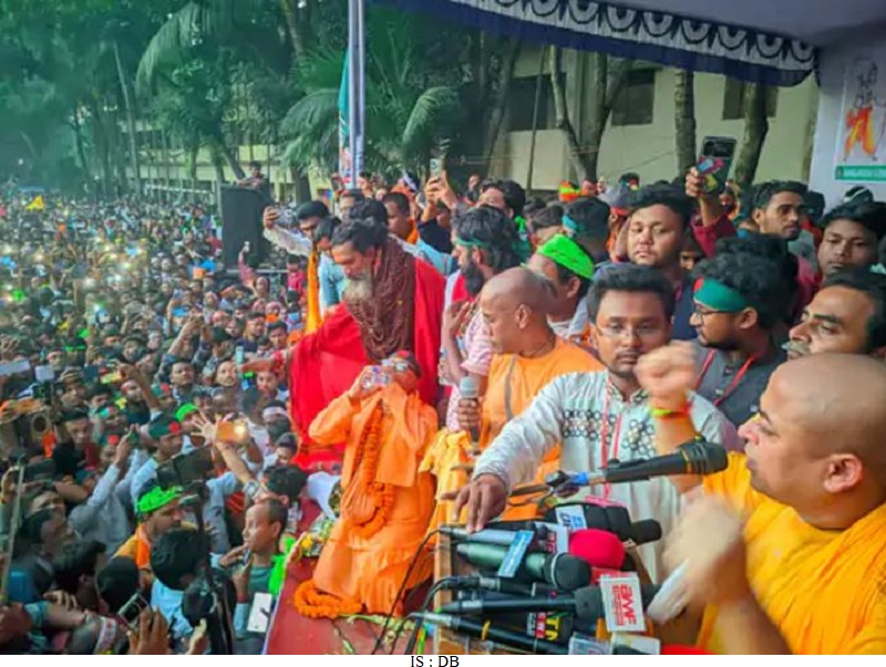 तो वहीं, चिन्मय दास ने कहा कि 1971 के स्वतंत्रता संग्राम में जान बचाने के लिए देश छोड़कर जाने वाले में 70% हिंदू थे। उनके घरों और संत्तियों को लूटा गया था। आजादी के इतने सालों बाद भी ये सिलसिला जारी है। चिन्मय दास ने आरोप लगाया कि 5 अगस्त के बाद देश में आंतकियों, उग्रवादियों और नेताओं को जेल से छोड़ा गया है। लेकिन किसी भी हिंदू को नहीं छोड़ा गया है। हिंदू किसी राजनीतिक पार्टी के समर्थक नहीं हैं। भविष्य में हिंदू उस पार्टी को वोट करेंगे, जो लोकतंत्र को बनाए रखेगी। उन्होंने कहा कि आज 3 करोड़ सनातनी एकजुट हैं। चिन्मय दास ने कहा कि रैली में शामिल होने आ रही बस पर हमला किया गया। उन्होंने घायलों में से एक व्यक्ति को मंच पर भी बुलाया। चिन्मय दास ने 21 नवंबर की रात प्रेस कॉन्फ्रेंस कर कहा कि उन्हें रंगपुर के होटल से निकलने के लिए कहा गया था। पुलिस ने उनसे कहा कि हमें यहां नहीं रखा जा सकता है।