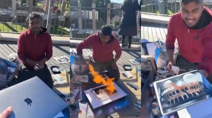 इसके बाद पेंट और आग की मदद से कागज के टुकड़ों और अन्य उपकरणों का उपयोग करके पेंटिंग बनाना शुरू कर दिया। किसी को समझ नहीं आया कि क्या हो रहा है? कुछ समय बाद जब फाइनल पेंटिंग बनकर तैयार हुई तो लोग इसकी प्रशंसा करने से खुद को रोक नहीं सके. लोग अपने लैपटॉप को सुरक्षित रखने के लिए या उसे अच्छा दिखाने के लिए वॉलपेपर लगाते हैं, लेकिन एक शख्स ने ऐसी अद्भुत पेंटिंग बनाई जिस पर लोगों को यकीन नहीं हो रहा है। वीडियो में एक शख्स को सड़क किनारे बैठे एक शख्स को अपना लैपटॉप देते हुए और उसे सहलाने के लिए कहते हुए देखा जा सकता है.