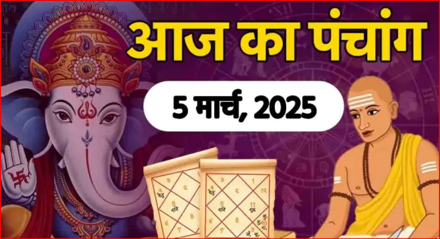 Aaj Ka Panchang 5 March 2025: आज 5 मार्च, 2025 को फाल्गुन माह का 21वां दिन है यानी आज इस माह के शुक्ल पक्ष की षष्ठी तिथि है। आज दिनमान यानी दिन की लंबाई 11 घंटे 41 मिनट 32 सेकंड की है, जबकि रात्रिमान 12 घंटे 17 मिनट 22 सेकंड की होगी। वैदिक ज्योतिष के अनुसार, यह वसंत ऋतु है और सूर्य वर्तमान में उत्तरायण में गोचर कर रहे हैं। आइए जानते हैं, 5 मार्च के पंचांग के पांचों अंग यानी तिथि, नक्षत्र, वार, योग और करण की क्या स्थितियां हैं? आज का कौन-सा समय आपके लिए शुभ सिद्ध होने के योग दर्शा रहा है और आज का राहु काल का समय क्या है?