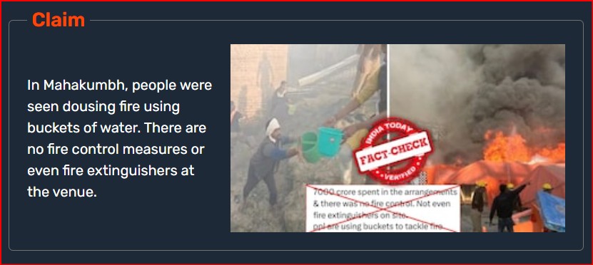 फैक्ट चेक ने पाया कि वायरल दावा झूठा है। हमें 19 जनवरी को महाकुंभ में लगी आग के बारे में कई खबरें मिलीं। इसे शाम करीब 4 बजे बुझाया गया। वीडियो रिपोर्ट में, कई फायर ब्रिगेड की गाड़ियों को आग बुझाते हुए देखा जा सकता है, जो वायरल दावे के विपरीत है। रिपोर्ट के अनुसार, उत्तर प्रदेश के मुख्यमंत्री योगी आदित्यनाथ भी घटना स्थल पर पहुंचे। वायरल तस्वीर को रिवर्स सर्च करने पर हमें एक वीडियो मिला। वायरल तस्वीर इसी वीडियो का स्क्रीनशॉट है। कई समाचार रिपोर्टों में उल्लेख किया गया है कि अधिकारी लगभग 30 मिनट में आग पर काबू पाने में सफल रहे और किसी के हताहत होने की खबर नहीं है।