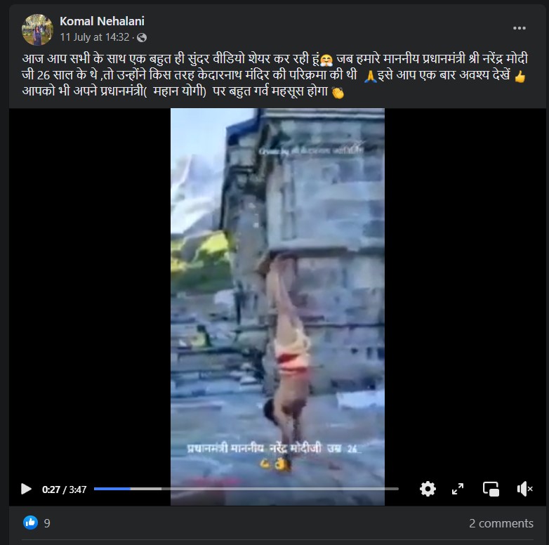 उत्तराखंड में केदारनाथ मंदिर परिसर के चारों ओर एक व्यक्ति को अपने हाथों पर चलते हुए दिखाया गया हैं जिसका एक वीडियो भी आजकल सोशल मीडिया पर वायरल हो रहा हैं । बताया जा रहा है कि, वायरल वीडियो, एक झूठे दावे के साथ व्हाट्सएप और सोशल मीडिया पर शेयर किया जा रहा हैं, जिसमें एक 26 वर्षीय व्यक्मि को दिखाया जा रहा हैं जिसको नरेंद्र मोदी बताया जा रहा है । आपकेा बता दें कि, वायरल वीडियो 21 जून, 2021 को अंतर्राष्ट्रीय योग दिवस मनाने के लिए मंदिर का हैं और इस वीडियो के के आसपास योग करते हुए देखा जा सकता है और इस वीडियों के साथ् लिखा गया है कि, मैं आप सभी के साथ एक बहुत ही सुंदर वीडियो साझा कर रहा हूं । जब हमारे माननीय प्रधान मंत्री श्री नरेंद्र मोदी जी 26 वर्ष के थे, उन्होंने केदारनाथ मंदिर की परिक्रमा कैसे की, आप इसे एक बार अवश्य देखें, आप अपने प्रधान मंत्री को भी देखें ।