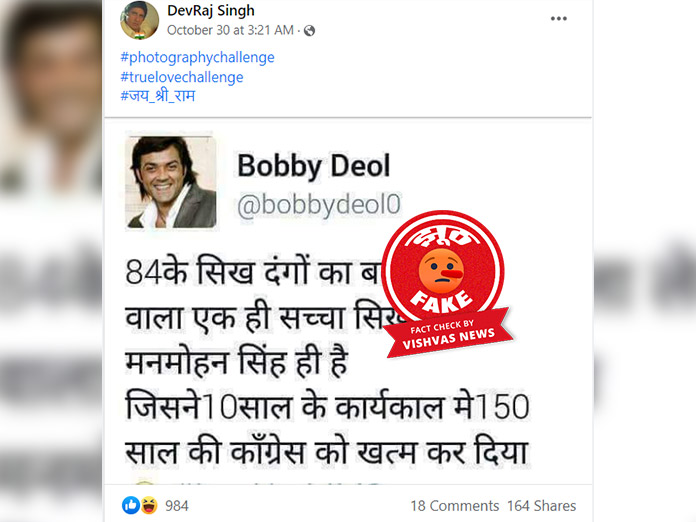 आजकल फिल्म अभिनेता बॉबी देओल के नाम से एक ट्वीट का स्क्रीनशॉट सोशल मीडिया पर काफी वायरल हो रहा है। इसकी प्रोफाइल पिक्चर में बॉबी देओल की फोटो है और आईडी @bobbydeol0 है । बता दें कि, इस मैसेज में पूर्व प्रधानमंत्री मनमोहन सिंह की आलोचना की जा रही हैं और कुछ उपयोगकर्ता इसको सच मानकर काफी शेयर कर रहे हैं । मगर जब हमने इसकी जांच की तो पाया कि, वायरल स्क्रीनशॉट बॉबी देओल के नाम से बनाए गए एक फर्जी अकाउंट का है जिसको निलंबित किया जा चुका हैं, जबकि बॉबी देओल का सत्यापित ट्विटर हैंडल @thedeol है।