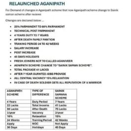 दरअसल, विभिन्न सोशल मीडिया प्लेटफॉर्म पर एक नोटिस शेयर किया जा रहा है जिसमें दावा किया जा रहा है कि सरकार ने अग्निपथ योजना का नाम बदलकर सैनिक सम्मान योजना कर दिया है। वायरल हो रहे नोटिस में बदलावों की जानकारी भी दी गई है. इसमें सेवा अवधि को 4 से बढ़ाकर 7 साल करने, प्रशिक्षण अवधि को 24 सप्ताह से बढ़ाकर 42 सप्ताह करने समेत कई अन्य बदलाव शामिल हैं. आप वायरल पोस्ट यहां और यहां देख सकते हैं।