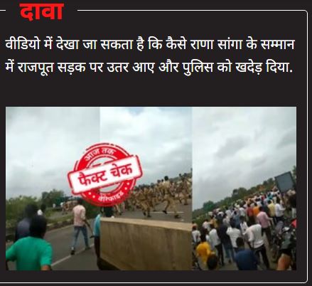 इस बीच, सोशल मीडिया पर एक वीडियो खूब शेयर किया जा रहा है, जिसमें भारी भीड़ एक पुल पर पुलिसकर्मियों की एक टीम को खदेड़ती नजर आ रही है। वीडियो के साथ कहा जा रहा है कि महाराणा सांगा के सम्मान में राजपूत समाज के लोग मैदान में उतरे हैं। इंस्टाग्राम पर कई लोगों ने इस कैप्शन के साथ वीडियो शेयर किया है।