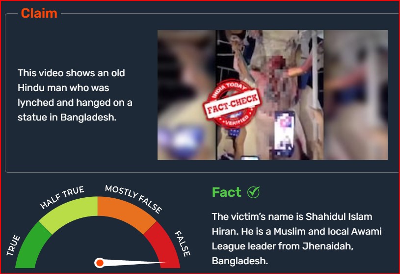एक एक्स यूजर ने क्लिप शेयर करते हुए लिखा, "दिल दहला देने वाला। बांग्लादेश में जमात-ए-इस्लामी के आतंकवादियों ने एक बूढ़े हिंदू व्यक्ति की पीट-पीट कर हत्या कर दी और उसे एक मूर्ति पर लटका दिया। इस्लामवादियों को उसके चारों ओर अल्लाह-हू-अकबर के नारे लगाते देखा गया..." बांग्लादेशी हिंदुओं को बचाओ।” इस पोस्ट का आर्काइव यहां देखा जा सकता है. फैक्ट चेक में पाया गया कि वीडियो में दिख रहा शख्स हिंदू नहीं था. वह अवामी लीग की जेनाइदाह सदर उपजिला इकाई के महासचिव और स्थानीय नगर निकाय के अध्यक्ष शाहिदुल इस्लाम हिरन हैं। वह एक मुस्लिम है.