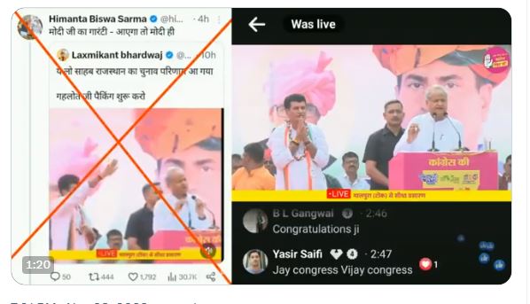 इस वीडियो की सच्चाई सामने लाने के लिए 'आजतक' और बूम समेत कई नेताओं ने फैक्ट चेक किया तो पता चला कि ये एक एडिटेड वीडियो है. मोदी-मोदी के नारे अलग से जोड़े गए हैं. राजस्थान बीजेपी के प्रवक्ता लक्ष्मीकांत भारद्वाज ने भी इस वीडियो को शेयर किया और कैप्शन दिया, 'सर, राजस्थान चुनाव नतीजे आ गए हैं, गहलोत जी पैकिंग शुरू करें।' इस वीडियो को असम सीएम हिमंत बिस्वा सरमा सहित कई सोशल मीडिया उपयोगकर्ताओं ने साझा किया, जिन्होंने दावा किया कि मोदी-मोदी के नारे सुने गए। हिमंत बिस्वा सरमा ने लक्ष्मीकांत के ही ट्वीट को री-ट्वीट किया और लिखा कि ये मोदी ही हैं जो गारंटी देंगे मोदी जी, लेकिन ये दावा झूठा साबित हुआ.
