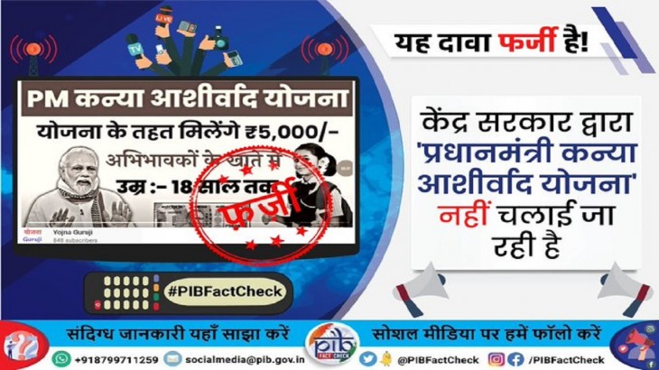 सोशल मीडिया पर इन दिनों एक प्लान की चर्चा हो रही है। इस योजना को सरकारी योजना से जोड़ा जा रहा है। एक यूट्यूब चैनल के जरिए दावा किया जा रहा है कि प्रधानमंत्री कन्या आशीर्वाद योजना के तहत सभी बेटियों को हर महीने 5 हजार रुपये की नकद राशि मिलेगी. जब पीआईबी की फैक्ट चेक टीम ने इस योजना की जांच की तो पता चला कि यह दावा पूरी तरह से फर्जी है। केंद्र सरकार द्वारा ऐसी कोई योजना नहीं चलाई जा रही है। पीआईबी की टीम ने नियमित रूप से स्क्रीनशॉट शेयर कर इस संदेश को दिखाने की कोशिश की है। योजना में दावा किया गया है कि बच्ची के माता-पिता के खाते में 18 साल की उम्र तक पांच हजार रुपये आएंगे. पीआईबी ने आम जनता से इस तरह के संदेशों को फॉरवर्ड न करने की अपील की है। इस तरह के मैसेज आम जनता में भ्रम फैलाने का काम करते हैं। इससे पहले भी सरकार की ओर से बेरोजगारी भत्ते को लेकर कई अफवाहें सुनने को मिली थीं. तब भी पीआईबी ने ऐसे संदेशों का पर्दाफाश किया था। बेरोजगारी भत्ता के रूप में पांच हजार रुपये का दावा किया गया था।