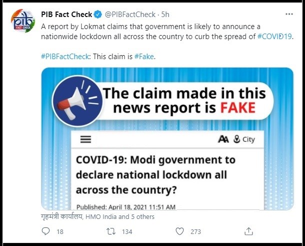 कोरोना वायरस की दूसरी लहर भारत में खतरनाक साबित होती जा रही है। हर रोज़ लाखो केसेस सामने आ रहे है | ऐसे में कुछ मीडिया रिपोर्ट में दावा किया जा रहा है कि मोदी सरकार जल्द ही पूरे देश में लॉकडाउन का ऐलान करने वाली है। जानते हैं कि इस दावे में कितनी सच्चाई है। असल में लोकमत वेबसाइट ने अपनी रिपोर्ट में दावा किया है कि कोरोना के बढ़ते हुए मामलों को देखते हुए मोदी सरकार पूरे देश में लॉकडाउन लगाने वाली है।परन्तु भारत के पत्र सूचना कार्यालय यानी (पीआईबी) ने इस दावे को फेक बताया है। लॉकडाउन लग रहा है यह दावा गलत है। देश में नहीं थम रहा कोरोना वायरस का कहर(Corona Cases in India)। पिछले 24 घंटे में करीब 2 लाख 75 हजार नए मरीज सामने आए। 16 सौ से अधिक लोगों की मौत। 1 लाख 44 हजार लोग रिकवर हुए। इलाज करा रहे मरीजों की संख्या 19 लाख के पार पहुंची।